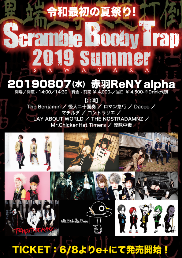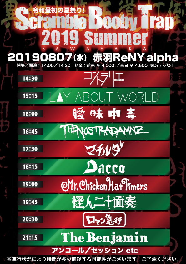 8/7 赤羽ReNY alphaで行われる元祖さわやか会Presents『Scramble Booby Trap 2019 Summer』のタイムテーブルが公開になりました。