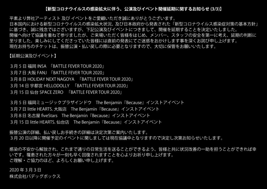 【新型コロナウイルスの感染拡大に伴う、公演及びイベント開催延期に関するお知らせ(3/3)】