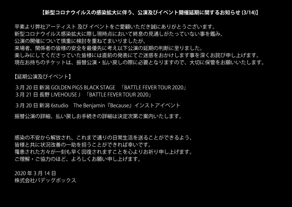 来場者、関係者の皆様の安全を最優先に考え以下公演の延期の判断に至りました。